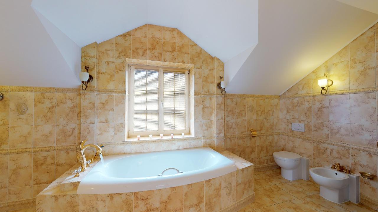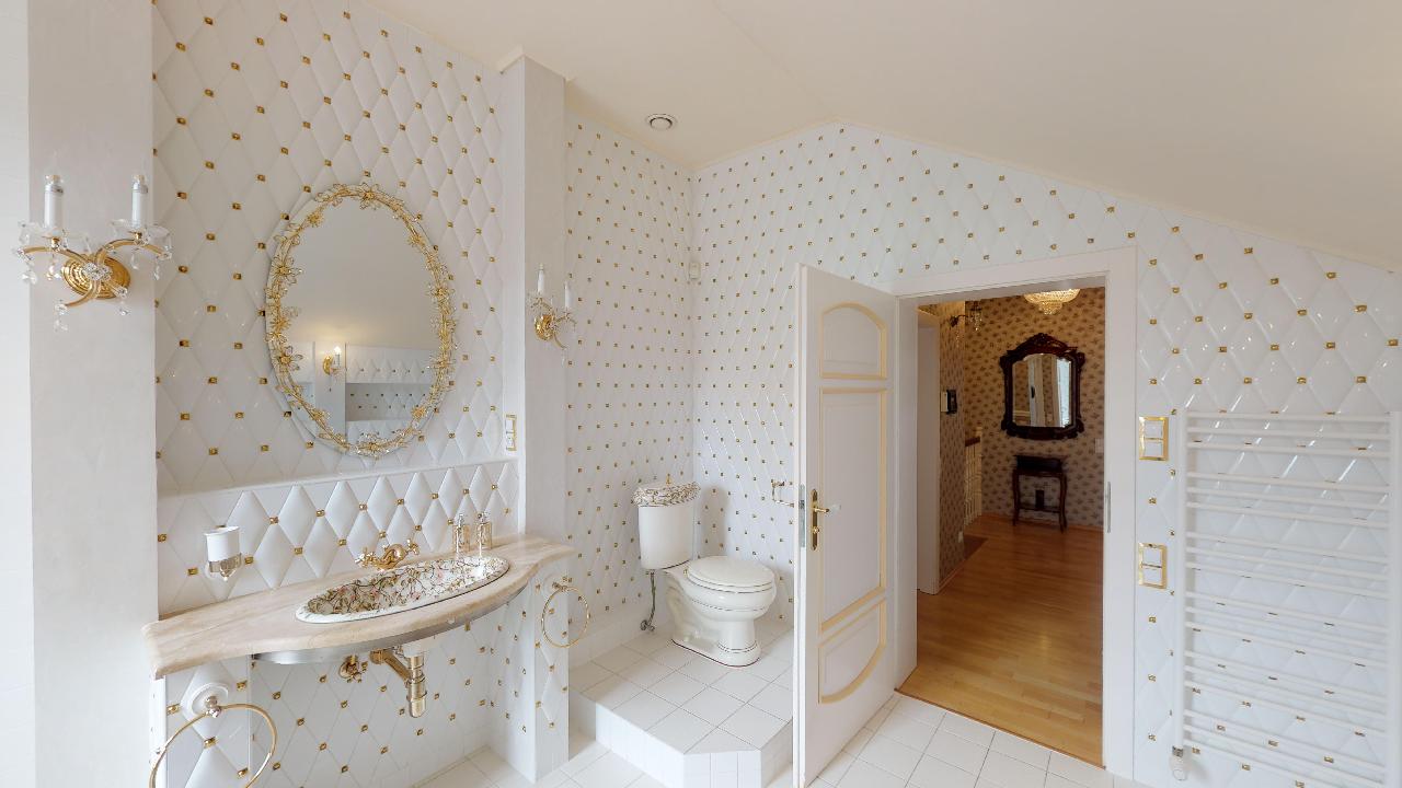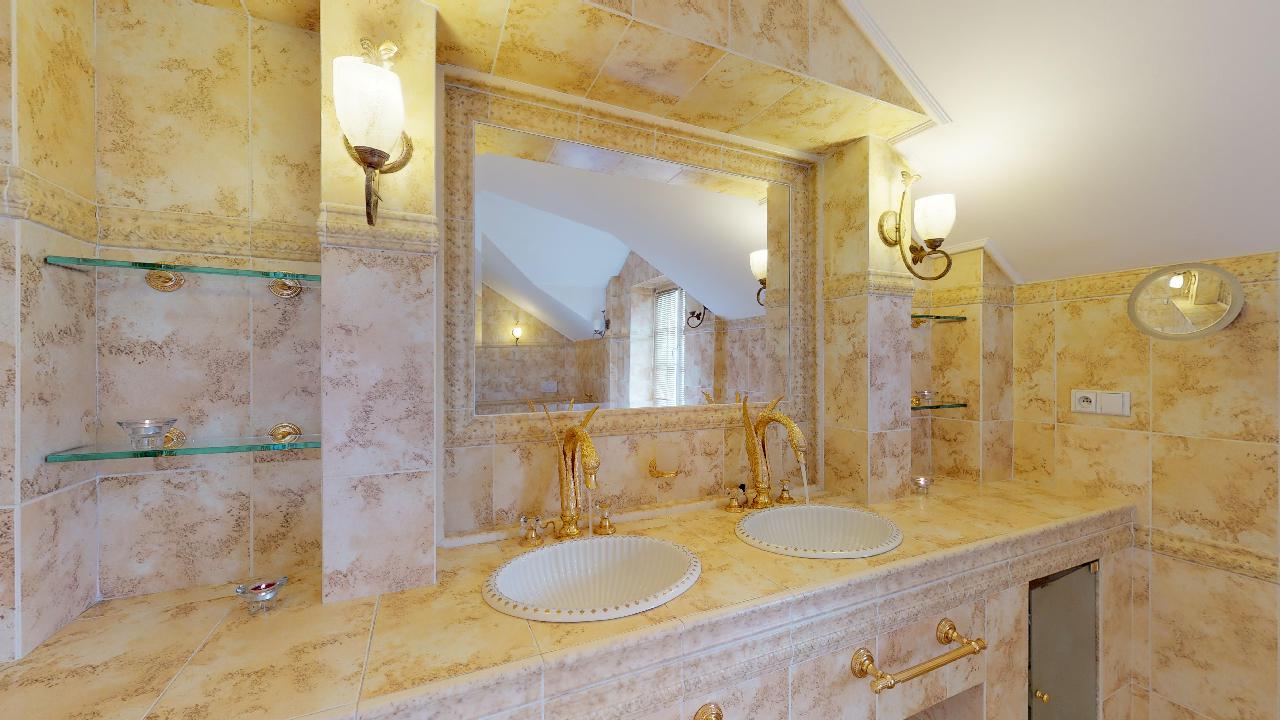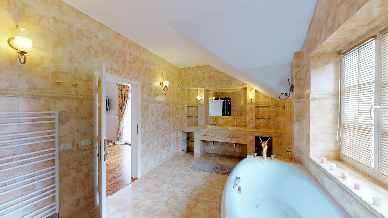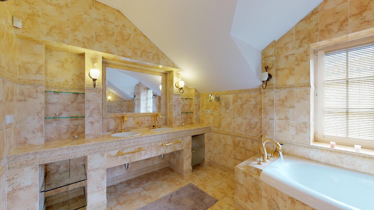 Dům je postavený v anglickém stylu. Pyšní se krbem, terasou, třemi ložnicemi, dvěmi luxusními koupelnami, čtyřmi toaletami, saunou, relaxační místností, fitness místností, pracovnou atd. Podlahy a veškerý nábytek jsou z kvalitních materiálů, stejně tak i bohatě zdobené koupelny se zlatými kohoutky. Prostorná garáž nabízí místo pro dvě osobní auta, kola a motorku.